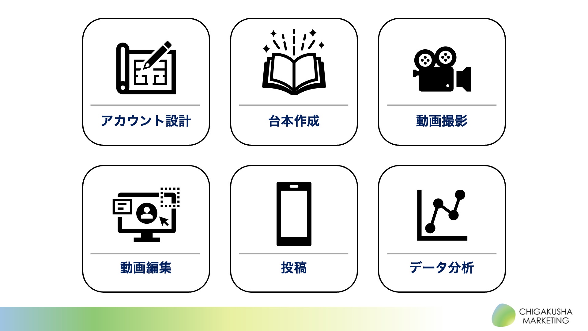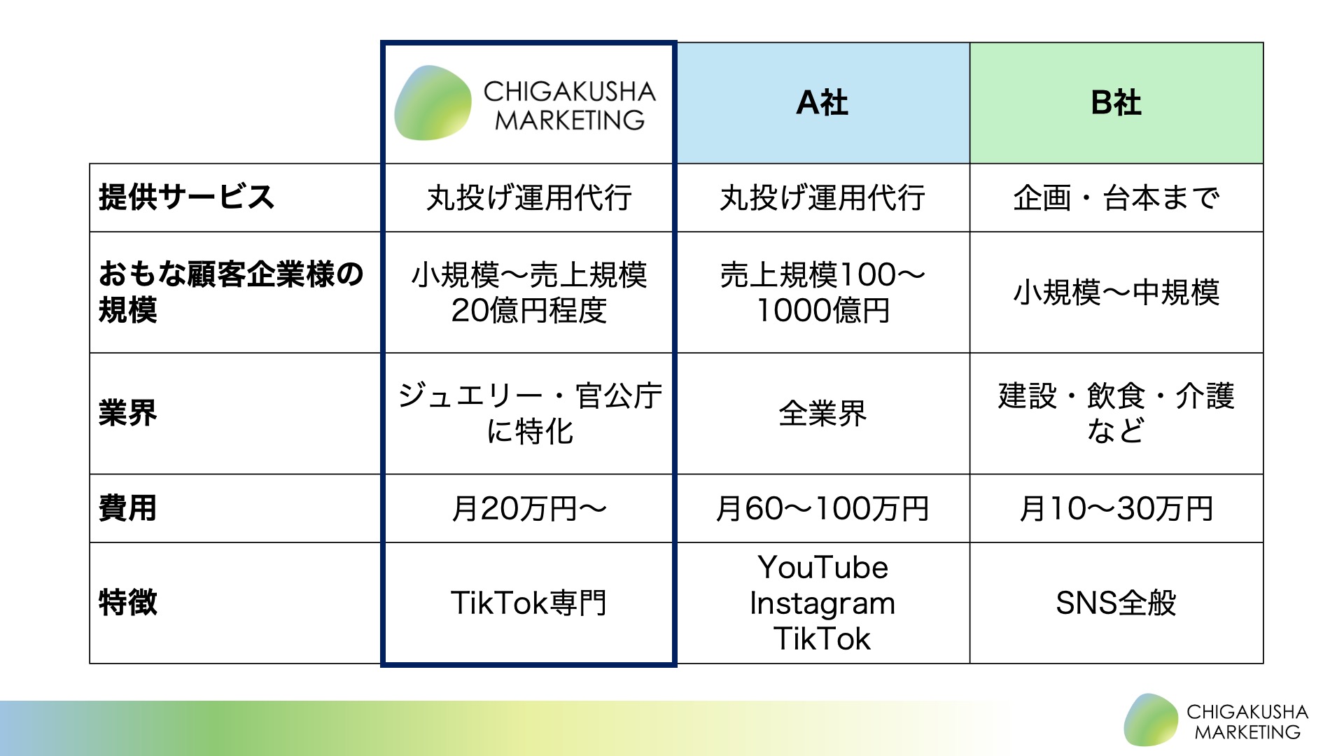 TikTok運用代行を行なっている会社は他にも多くあります。私たち地学舎マーケティングのサービスの特徴は、次の5つです。