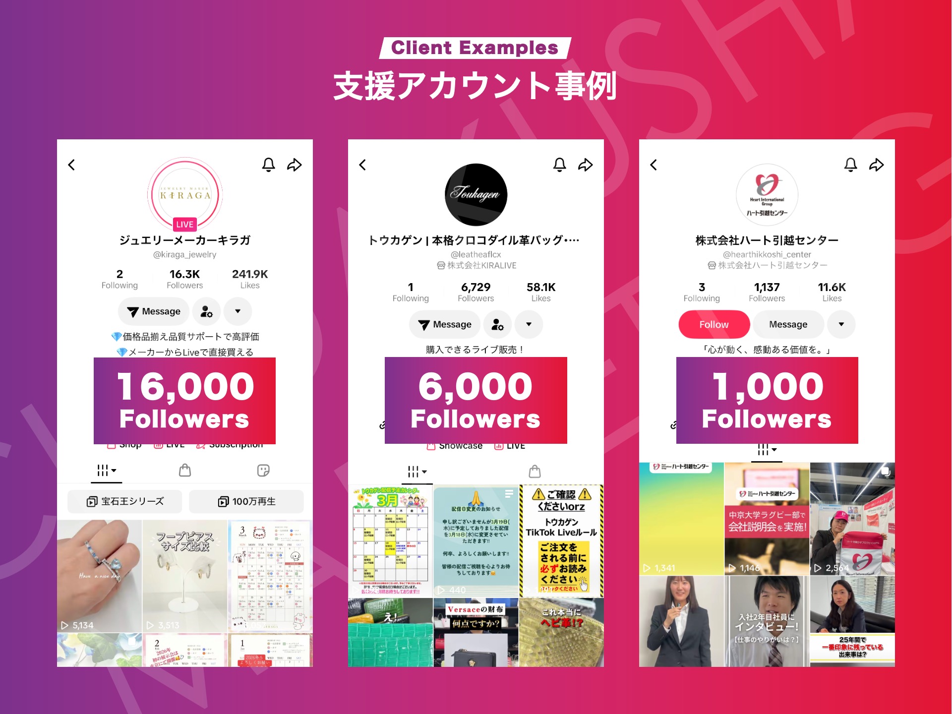 企業様や個人事業主様に対して、これまでに30アカウント以上の運用実績があり、例えば10万フォロワー以上のアカウントや2週間で5万フォロワー増加したアカウント、ライブ販売で月2000万売り上げるお客様など、数多くの目覚ましい結果が得られております。