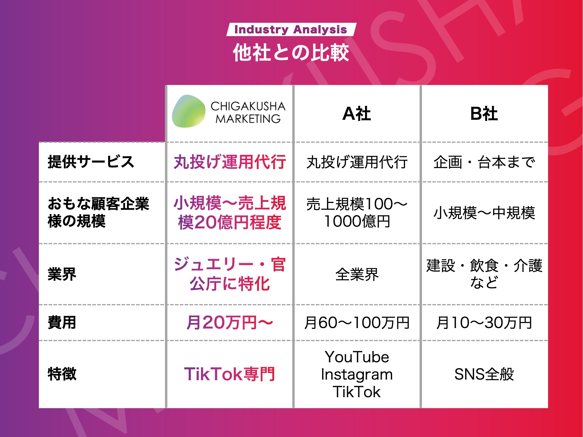 TikTok運用代行を行なっている会社は他にも多くあります。私たち地学舎マーケティングのサービスの特徴は、次の5つです。