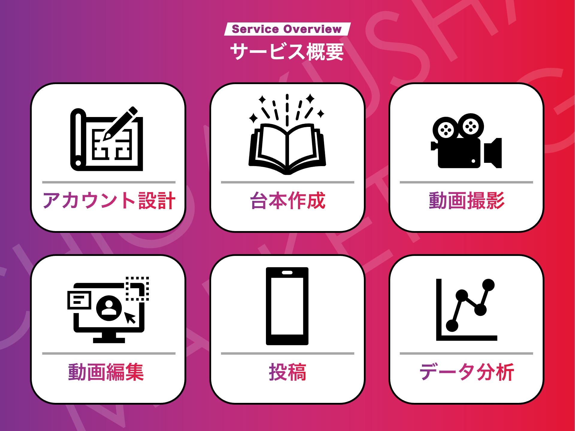 - 企画から動画撮影、編集、投稿まで、ワンストップで丸投げできます。